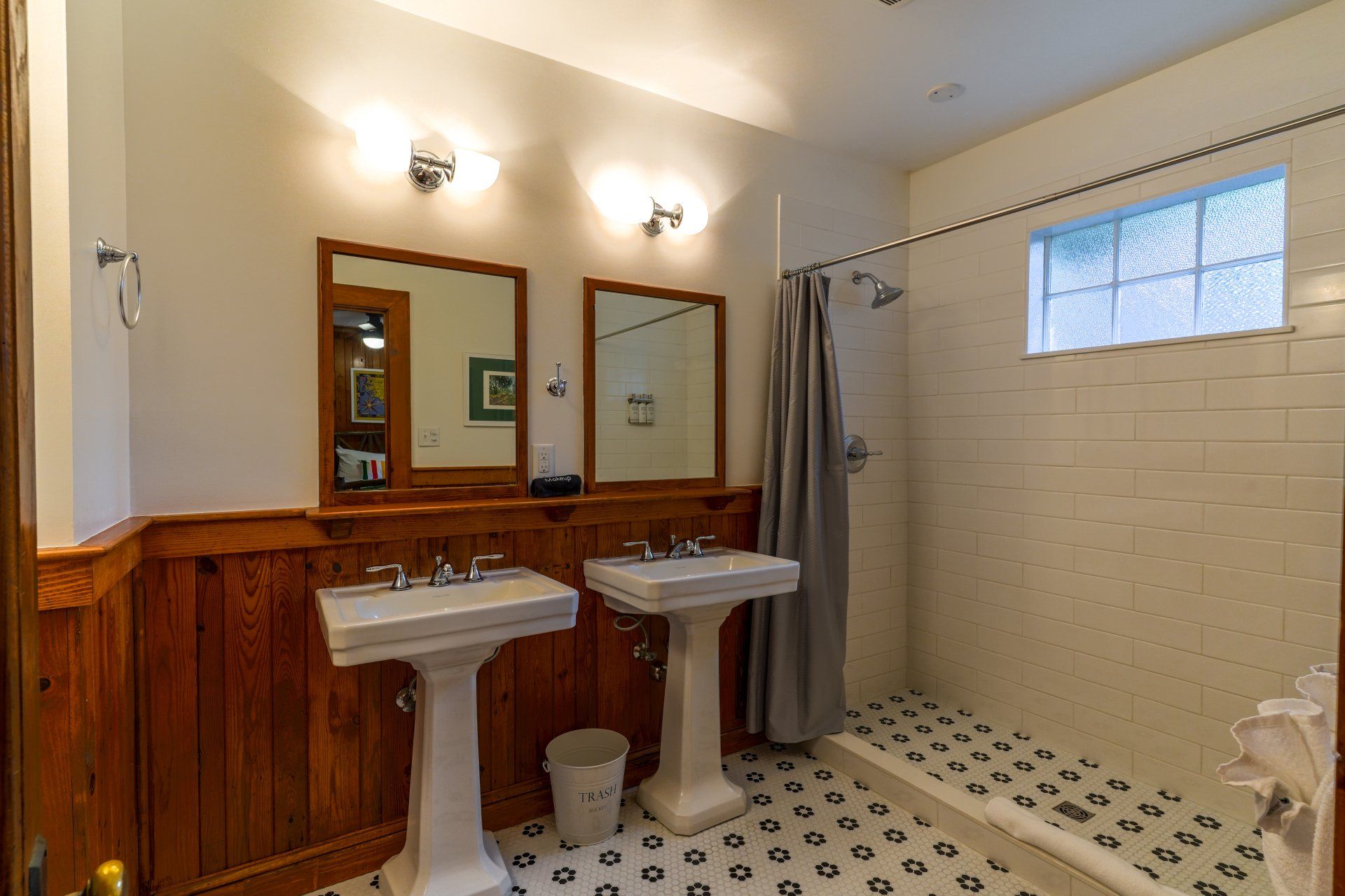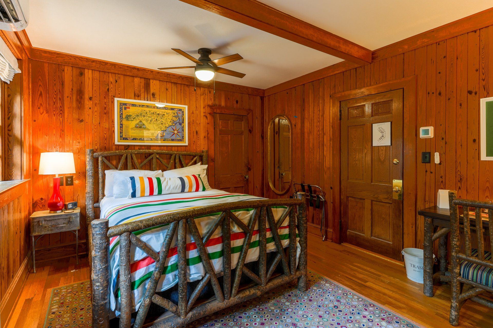Located in the main building on the lower level floor with stairs needed to access the guest quarters, this particular room has a queen bed and, like all other rooms, has a wall mounted television, guest controlled temperature, a desk, and a ceiling fan. The renovated bathroom has two vanities and a shower only - no tub. While there are windows in the room, there is no view.