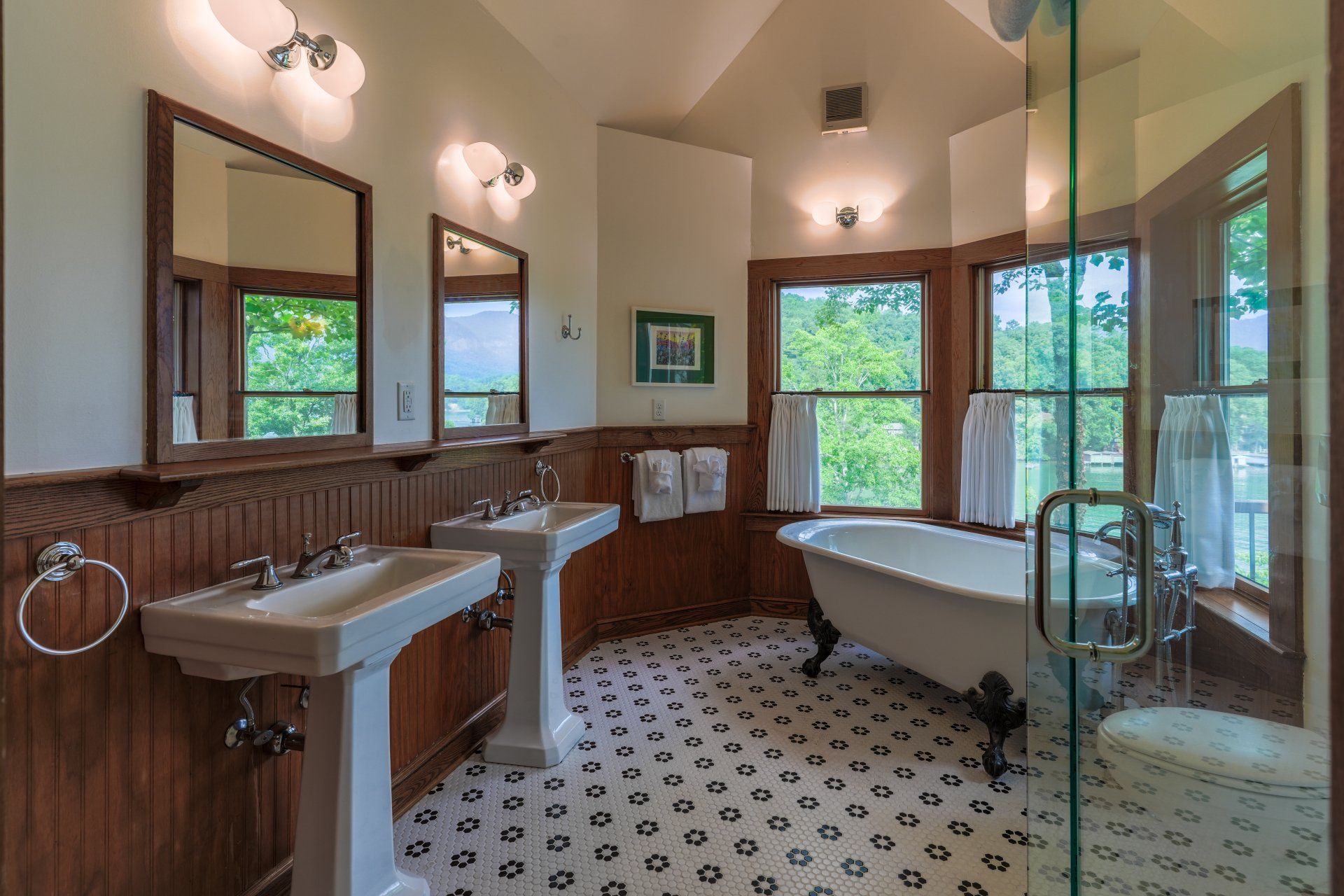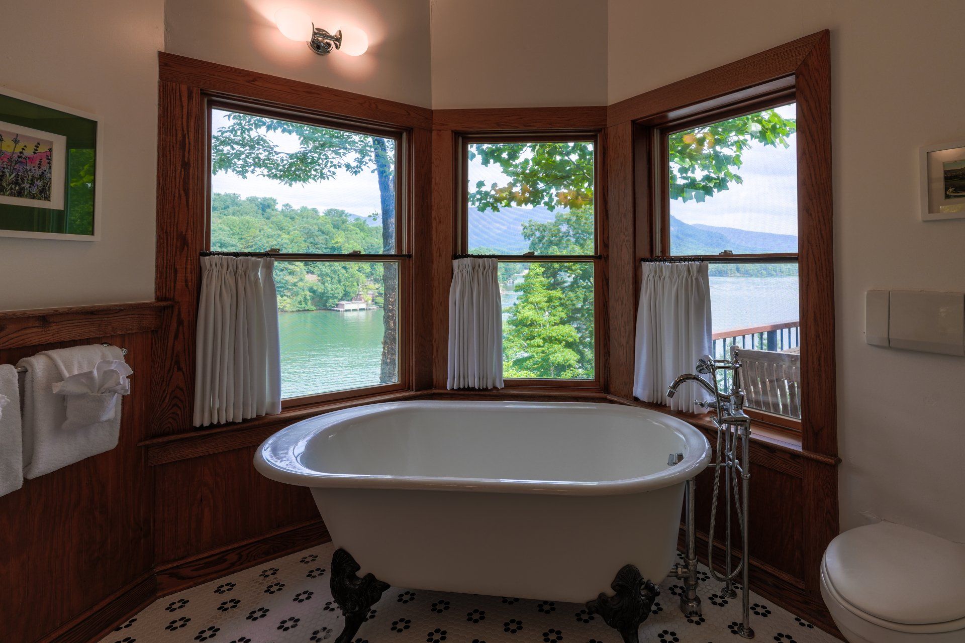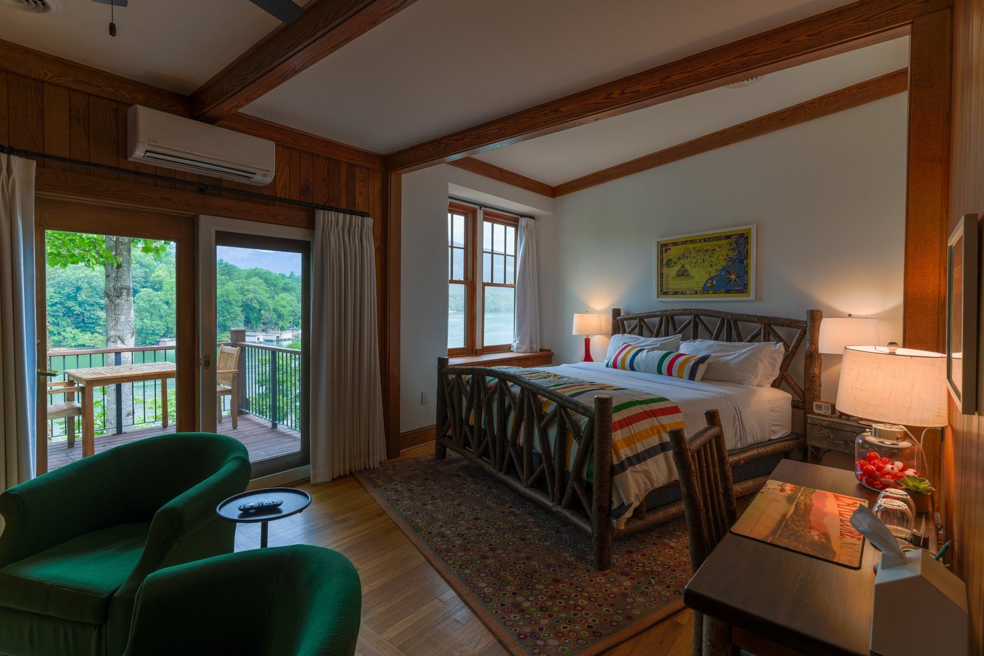 Located in the main building on the entry level floor with no stairs to access the guest quarters, this particular room has a king bed and, like all other rooms, has a wall mounted television, guest controlled temperature, a desk, and a ceiling fan. There is a sitting area in the room along with a private balcony that faces the lake and mountains. The bathroom has a tub along with a separate shower with beautiful views of the lake.