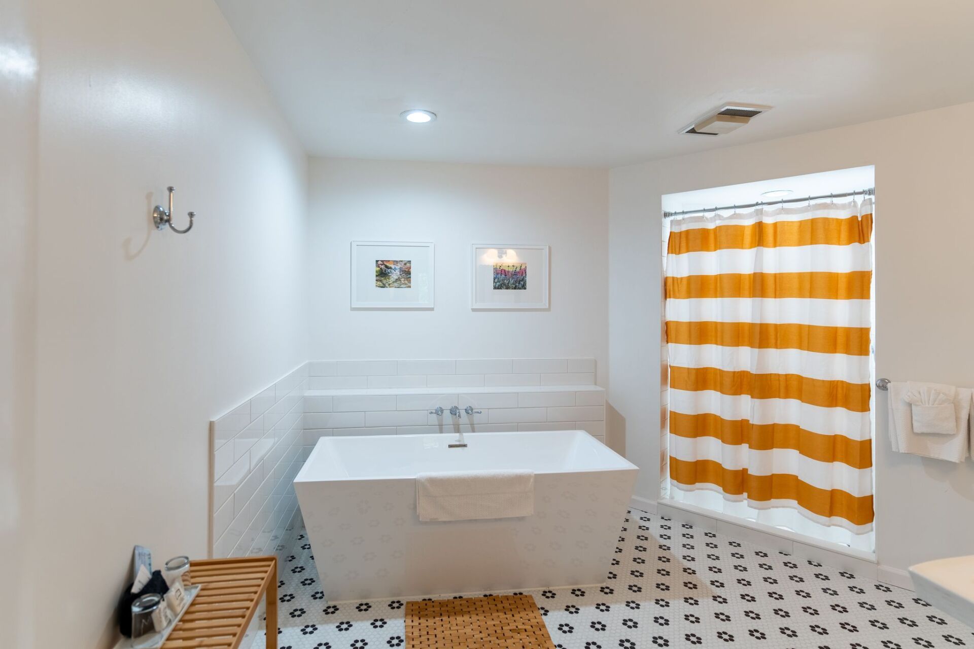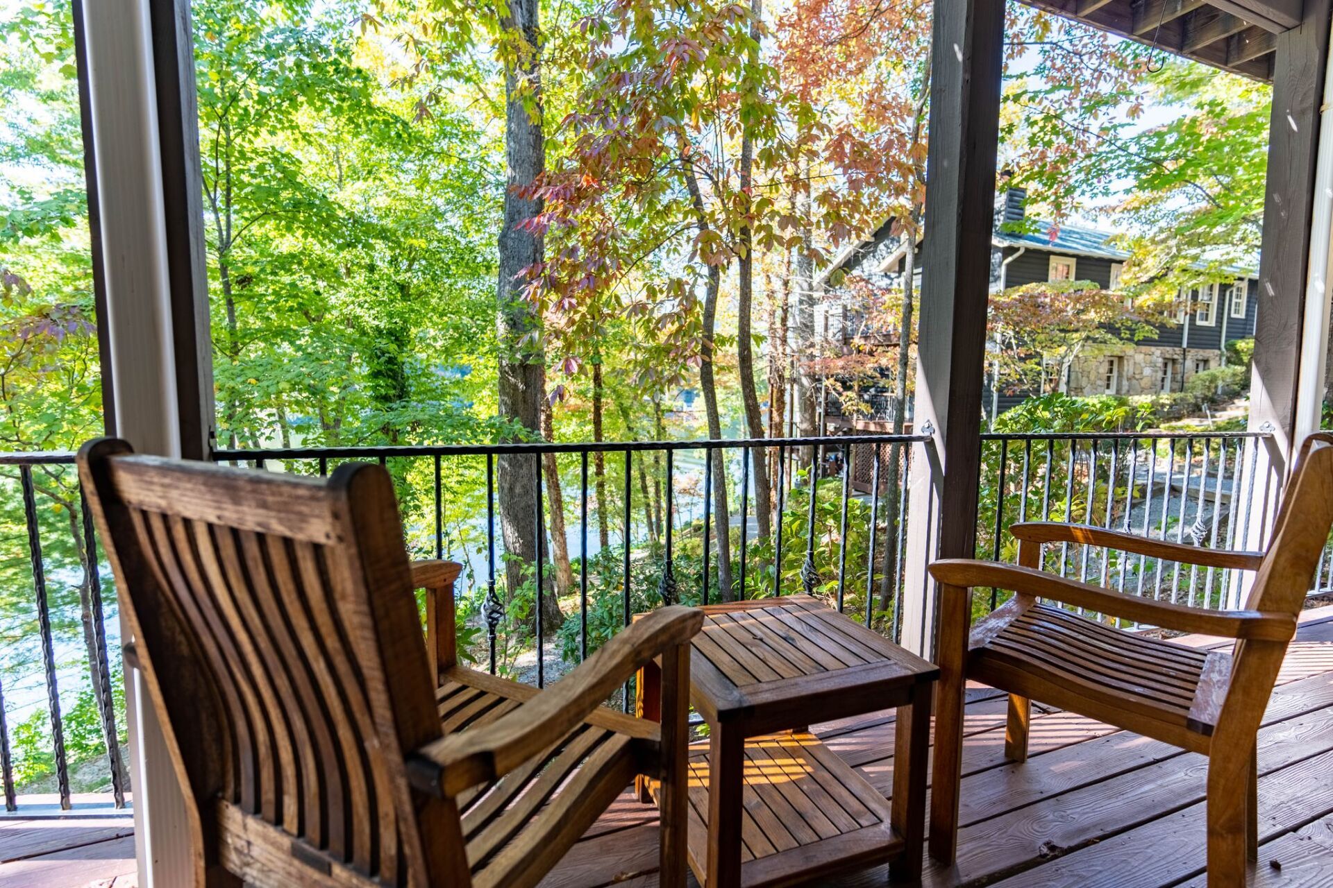 Located in our “Cabin” building, this room has a king bed and, like all other rooms, has a wall mounted television, guest controlled temperature, a desk, refrigerator, and a ceiling fan. There is a non-private sitting area on the deck that has partial views of the lake. The room does come with a tub and separate shower. This accommodation has an exterior entry to the room, is accessible by stairs.