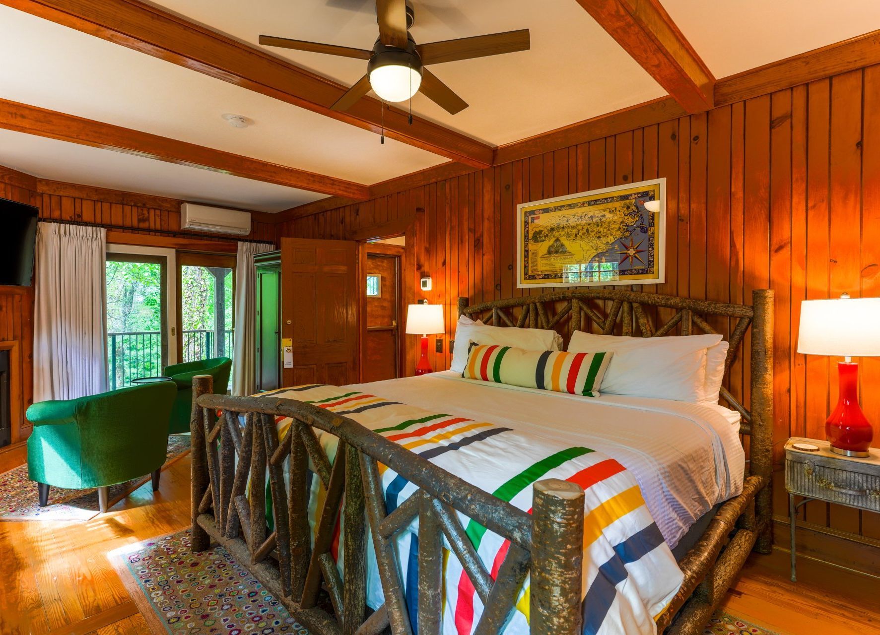 Located in the main building at the end of the hallway on the lower level floor with stairs needed to access the guest quarters, this particular room has a king bed and, like all other rooms, has a wall mounted television, guest controlled temperature, a desk, and a ceiling fan. The renovated bathroom has a shower only - no tub. There is a sitting area in the room along with a non-private deck area outside. While the room is not lakefront, it does have a partial view of the lake.